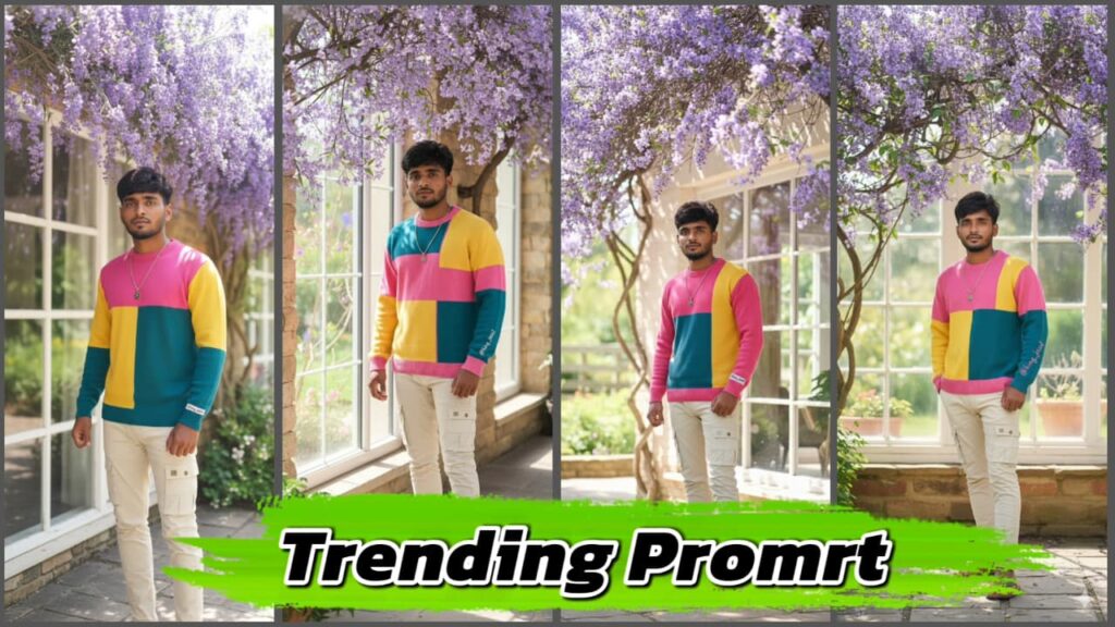 Generate an Ultra-Realistic True to reality Portrait of the subject ( maintain 100% facial accuracy) standing unter the Lavender vine and just beside the Window under bright vibrant sun, wearing a Knitware Sweater containing Aesthetic minimal Colorblock pattern of vibrant.A stylish young man with a neatly trimmed beard and dark hair stands in front of a window, looking directly at the camera.He is wearing a colorful, color-blocked sweater with shades of pink, yellow, and