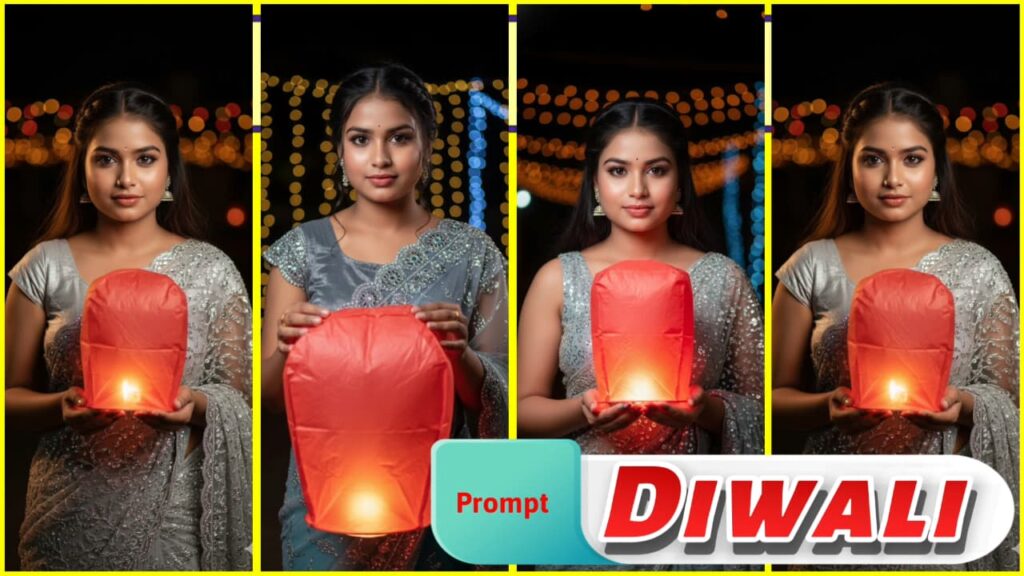 Hyper-realistic 8K portrait of an Indian woman wearing a silver glitter and stone net saree with a sleeveless blouse. Long dark hair in half-updo with braided sections, soft glowing makeup. She holds a red sky lantern at night — warm light on her face, dark festive background with magical bokeh. Use the same face from the uploaded reference image, cinematic lighting, natural skin texture.